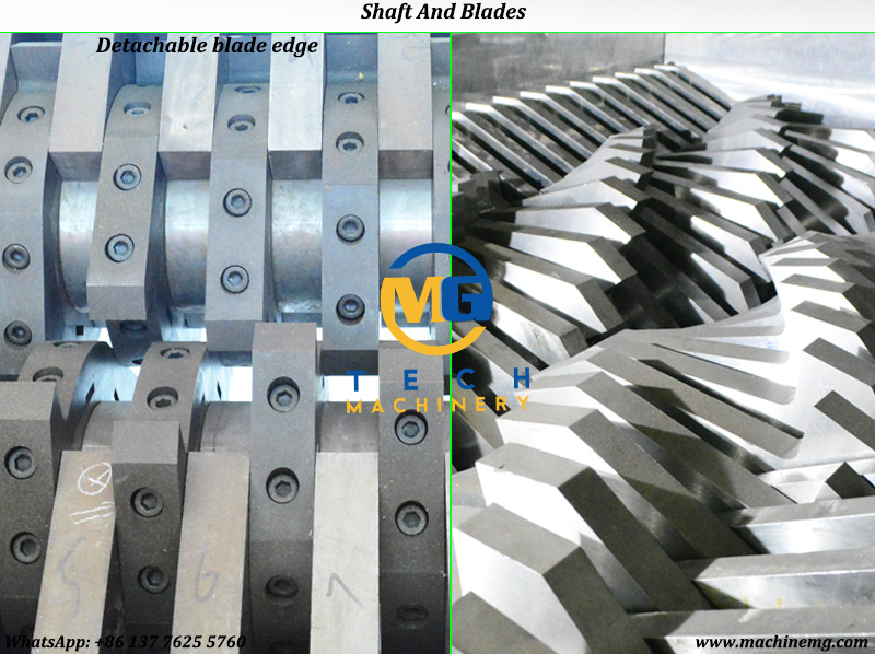 3, Cutting shredding system: two shafts with more diameter, stationary and rotary blades are made of H13 with more hardness and good durability, thick steel boards are used for making the chamber walls. Different claw blades with more thickness are optional according to the shredding requirements.